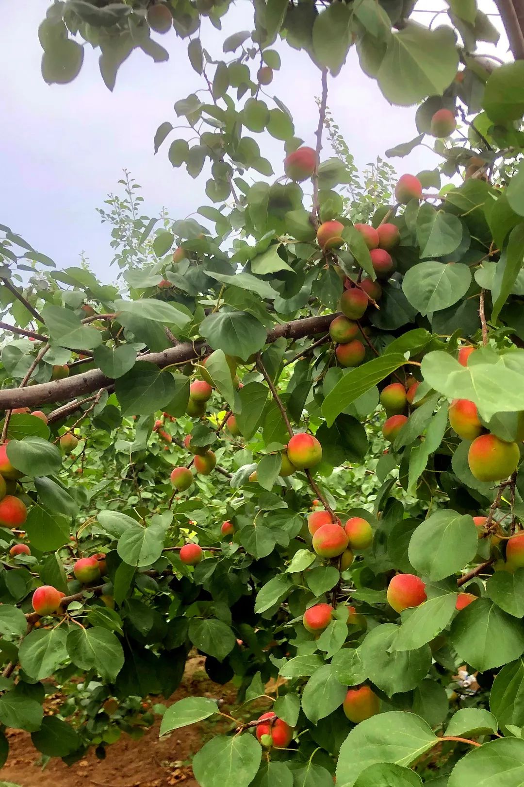 整整齐齐的杏林,黄澄澄的杏子挂满枝头,红黄透亮饱满圆润,微风吹来丝丝果香,清新、自然,让人回味无穷。