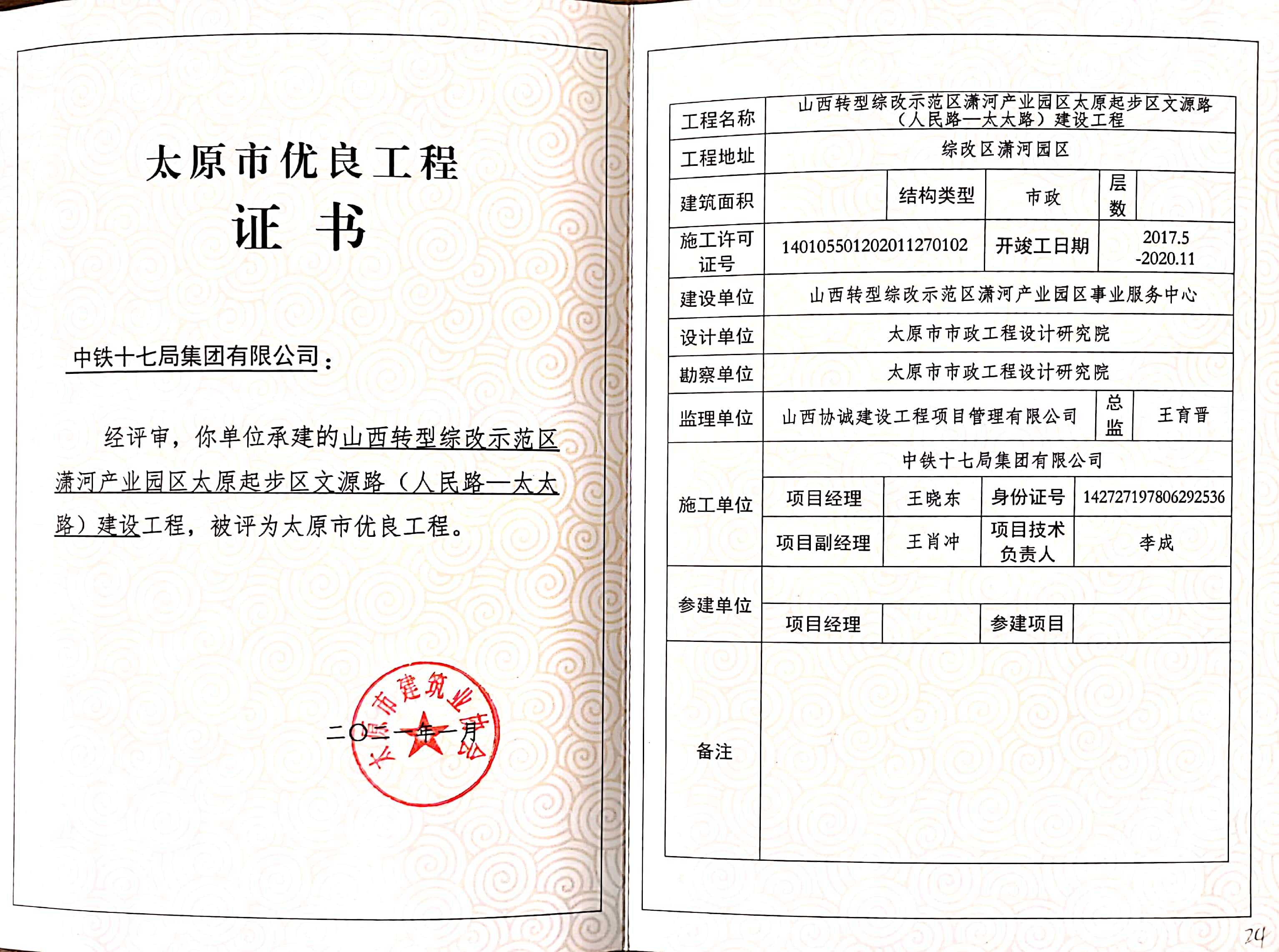 山西转型综改示范区潇河产业园区太原起步区文源路(人民路-太太路)建设项目荣获太原市优良工程奖