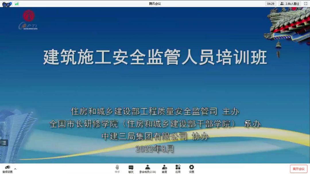 3、8月23、24日,国家住房和城乡建设部工程质量安全监管司发起举办“建筑施工安全监管人员培训班”, 公司组织各事业部、各项目监理部,运用网络平台,在线上对培训内容进行了收听收看。