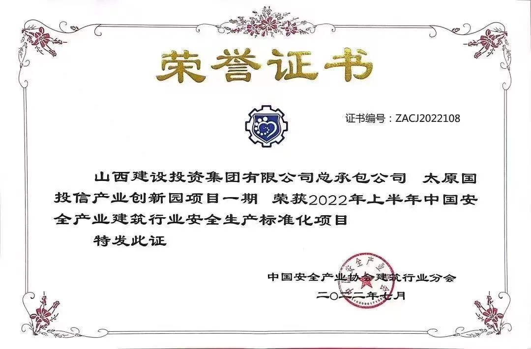 2、近日,公司监理的太原国投信产业创新园项目一期工程,荣获2022年上半年中国安全产业建筑行业安全生产标准化项目。