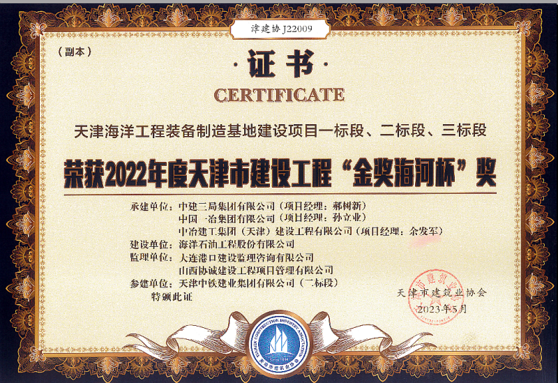 4、喜讯!公司监理的天津海洋工程装备制造基地建设项目,荣获天津市建筑业协会颁发的2022年度天津市建设工程“金奖海河杯”奖。