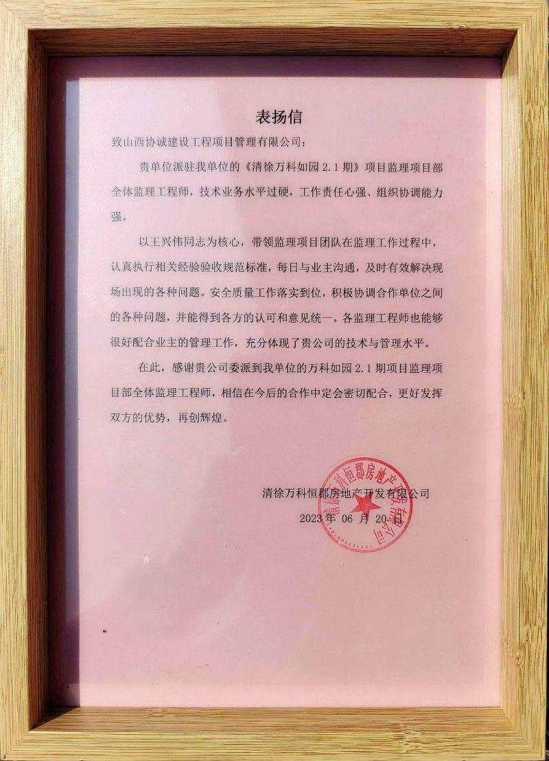 5、近日,公司承监的清徐万科如园2.1期项目建设单位向公司递交了一份《表扬信》,对我公司王兴伟同志为总监的项目监理团队表现出的良好的专业技术水平和认真负责的工作精神予以高度赞扬。