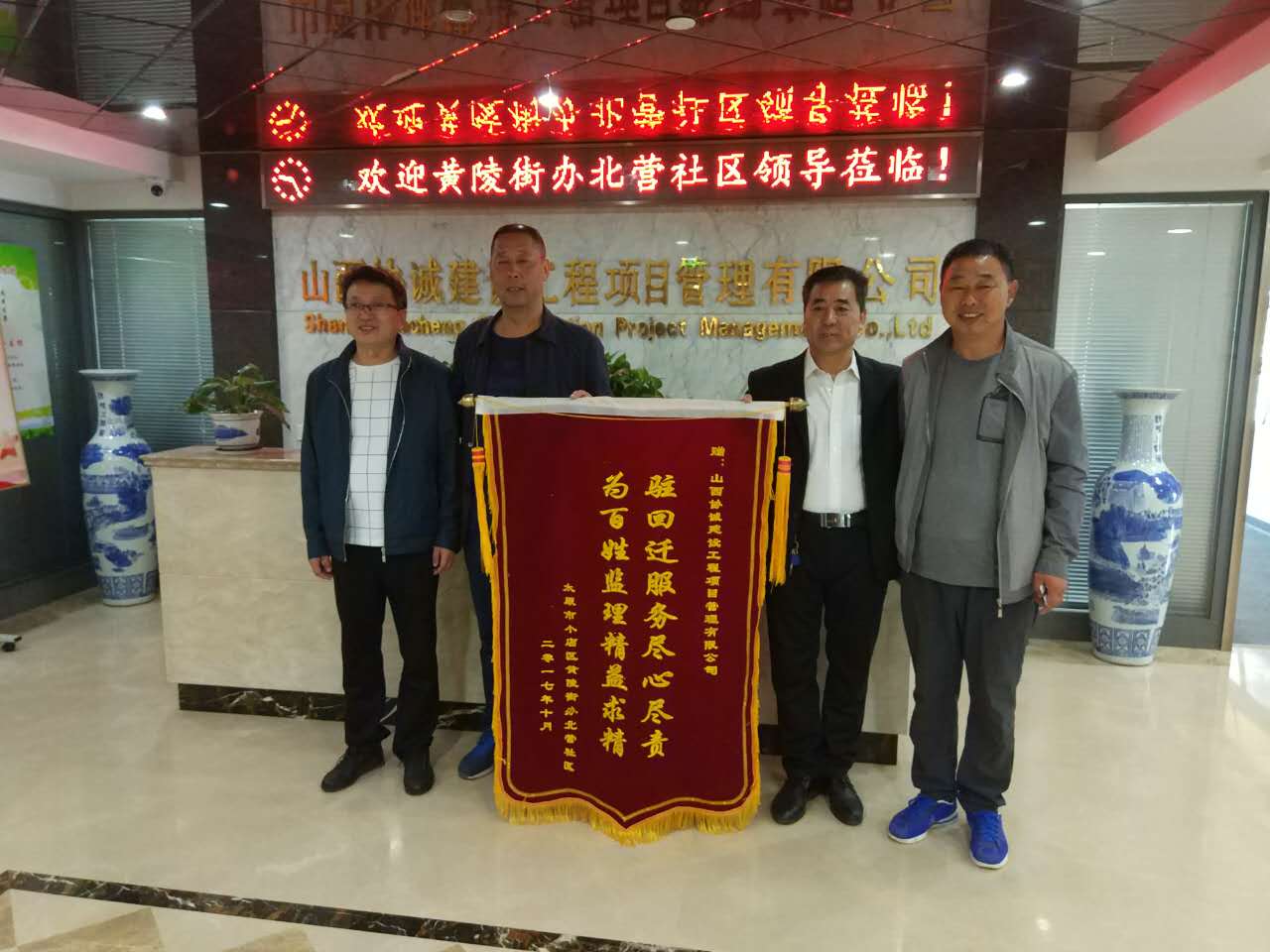 9月29日,太原市小店区黄陵街办北营社区领导杨国庆等一行来公司赠送锦旗,公司副总经理平利接待了来宾。杨国庆说:“我代表北营社区全体老百姓向贵公司表示感谢,感谢公司万科北营回迁项目人员所做的工作,使工程项目成为我们老百姓的放心工程。”副总经理平利对来宾表达了谢意,希望双方在今后的工作中继续密切合作,确保工程保质保量按时完成。