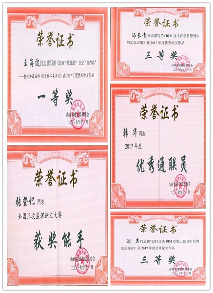 在受表彰的个人奖项中,公司总经理王海波撰写的“国家放管服企业练内功”一文获“2017年度百篇优秀论文一等奖”;冯长青撰写的《BIM技术在项目管理中实际运用》、刘岩撰写的《浅谈BIM在施工监理阶段的运用探讨》等两篇论文荣获“2017年度百篇优秀论文三等奖”;张登记荣获监理论文大赛“获奖能手”的荣誉称号;韩华荣获“优秀通联员”荣誉称号。