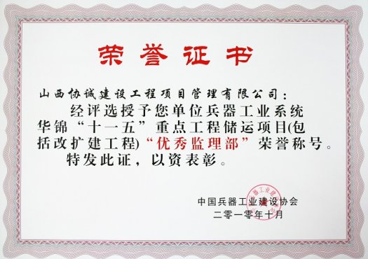 公司荣获“兵器工业系统‘十一五’重点工程储运项目“优秀监理部””