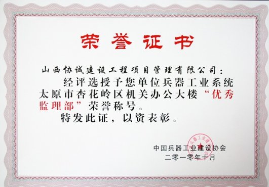 公司杏花岭区政府大楼项目部荣获“2010年兵器行业先进监理部”