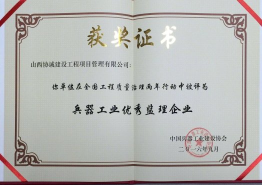 公司荣获中国兵器工业建设协会“兵器工业优秀监理企业”荣誉称号 公司近期在中国兵器工业建设协会组织的全国工程质量治理两年行动评选中,被授予 兵器工业优秀监理企业荣誉称号。 2016年荣誉 2016年09月12日 0 点赞 0 评论 4030 浏览